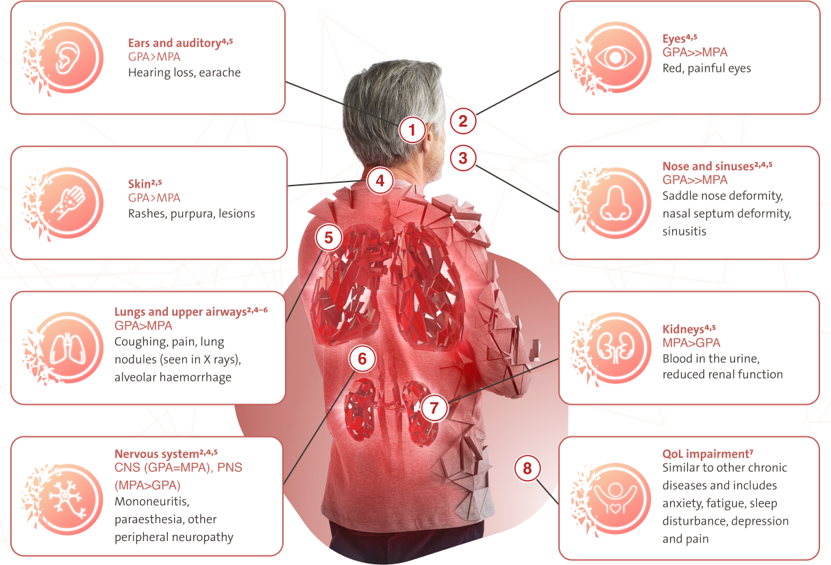 AAV (GPA/MPA) is a severe, relapsing disease that can cause irreversible damage to multiple organs2–4
